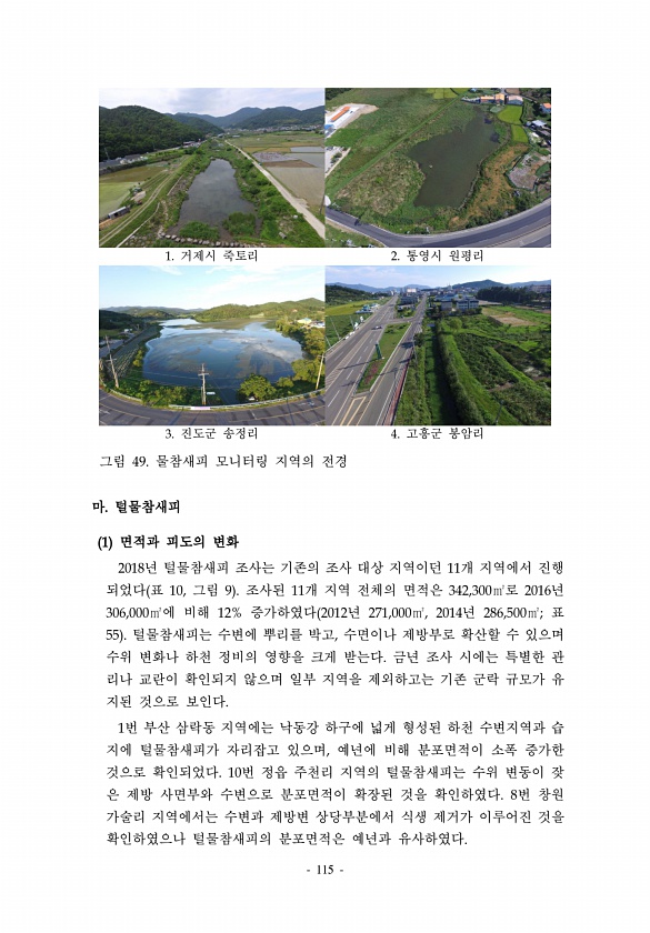115 1. 거제시 죽토리 2. 통영시 원평리 3. 진도군 송정리 4. 고흥군 봉암리 그림 49. 물참새피 모니터링 지역의 전경 마. 털물참새피 1 면적과 피도의 변화 2018년 털물참새피 조사는 기존의 조사 대상 지역이던 11개 지역에서 진행 되었다 표 10, 그림 9 조사된 11개 지역 전체의 면적은 342,300㎡로 2016년 306,000㎡에 비해 12% 증가하였다 2012년 271,000㎡, 2014년 286,500㎡; 표 55 털물참새피는 수변에 뿌리를 박고, 수면이나 제방부로 확산할 수 있으며 수위 변화나 하천 정비의 영향을 크게 받는다. 금년 조사 시에는 특별한 관 리나 교란이 확인되지 않으며 일부 지역을 제외하고는 기존 군락 규모가 유 지된 것으로 보인다. 1번 부산 삼락동 지역에는 낙동강 ...