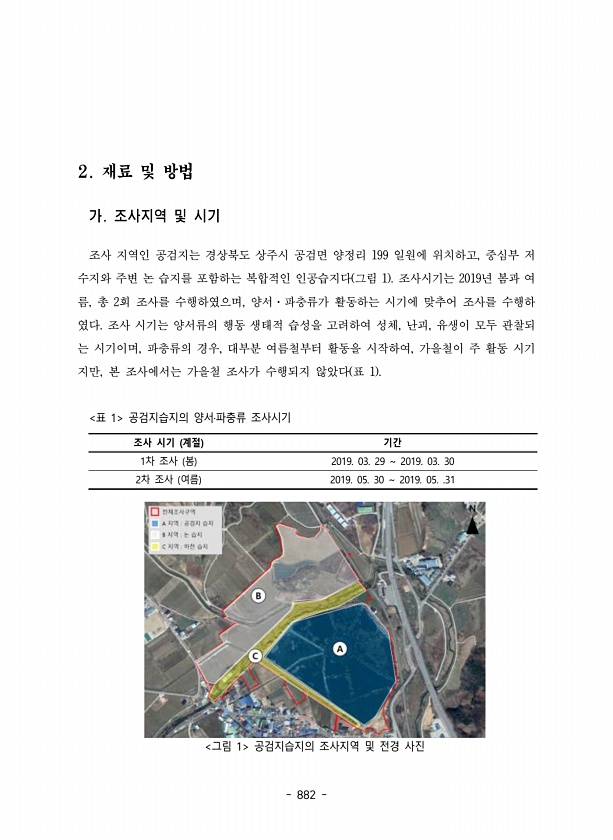 882 2. 재료 및 방법 가. 조사지역 및 시기 조사 지역인 공검지는 경상북도 상주시 공검면 양정리 199 일원에 위치하고, 중심부 저 수지와 주변 논 습지를 포함하는 복합적인 인공습지다 그림 1 조사시기는 2019년 봄과 여 름, 총 2회 조사를 수행하였으며, 양서·파충류가 활동하는 시기에 맞추어 조사를 수행하 였다. 조사 시기는 양서류의 행동 생태적 습성을 고려하여 성체, 난괴, 유생이 모두 관찰되 는 시기이며, 파충류의 경우, 대부분 여름철부터 활동을 시작하여, 가을철이 주 활동 시기 지만, 본 조사에서는 가을철 조사가 수행되지 않았다 표 1 조사 시기 계절 기간 1차 조사 봄 2019. 03. 29 2019. 03. 30 2차 조사 여름 2019. 05. 30 2019. 05. .31 표 1 공검지...