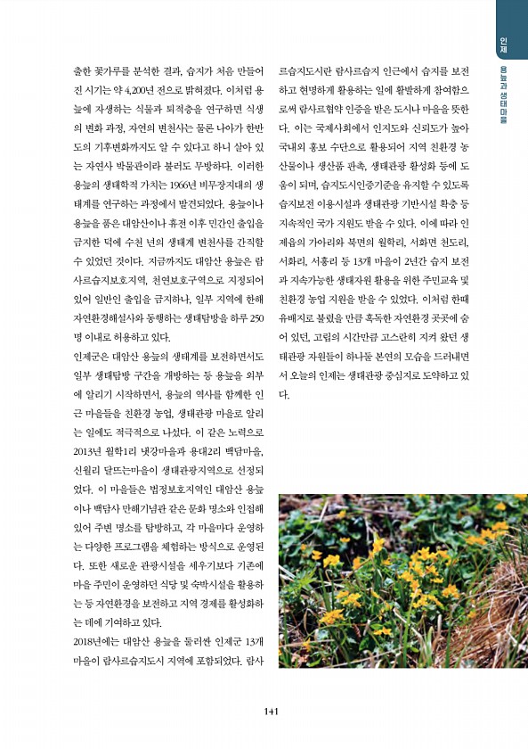 141 인제 용 용 용 용용 용 용 용 출한 꽃가루를 분석한 결과, 습지가 처음 만들어 진 시기는 약 4,200년 전으로 밝혀졌다. 이처럼 용 늪에 자생하는 식물과 퇴적층을 연구하면 식생 의 변화 과정, 자연의 변천사는 물론 나아가 한반 도의 기후변화까지도 알 수 있다고 하니 살아 있 는 자연사 박물관이라 불러도 무방하다. 이러한 용늪의 생태학적 가치는 1966년 비무장지대의 생 태계를 연구하는 과정에서 발견되었다. 용늪이나 용늪을 품은 대암산이나 휴전 이후 민간인 출입을 금지한 덕에 수천 년의 생태계 변천사를 간직할 수 있었던 것이다. 지금까지도 대암산 용늪은 람 사르습지보호지역, 천연보호구역으로 지정되어 있어 일반인 출입을 금지하나, 일부 지역에 한해 자연환경해설사와 동행하는 생태탐방을 하루 250 명 ...