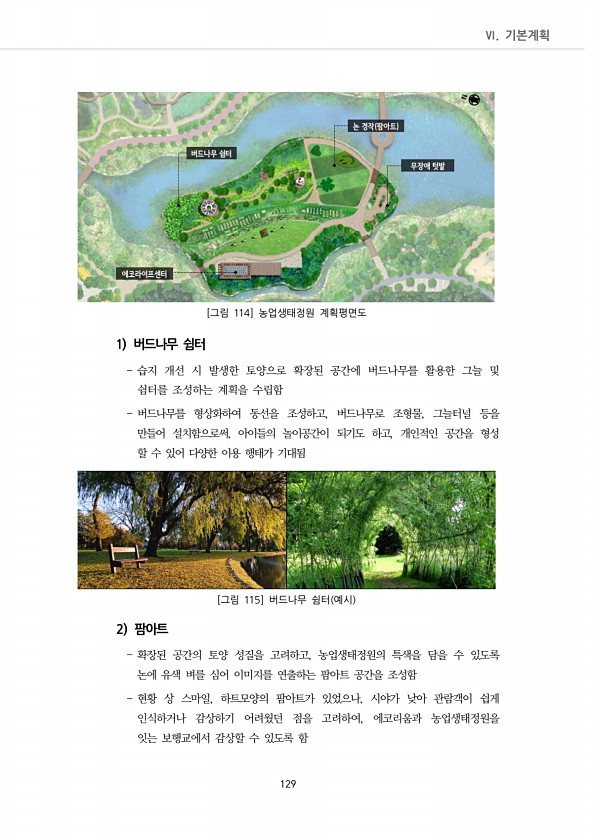 Ⅵ. 기본계획 129 [그림 114] 농업생태정원 계획평면도 1 버드나무 쉼터 습지 개선 시 발생한 토양으로 확장된 공간에 버드나무를 활용한 그늘 및 쉼터를 조성하는 계획을 수립함 버드나무를 형상화하여 동선을 조성하고, 버드나무로 조형물, 그늘터널 등을 만들어 설치함으로써, 아이들의 놀이공간이 되기도 하고, 개인적인 공간을 형성 할 수 있어 다양한 이용 행태가 기대됨 [그림 115] 버드나무 쉼터 예시 2 팜아트 확장된 공간의 토양 성질을 고려하고, 농업생태정원의 특색을 담을 수 있도록 논에 유색 벼를 심어 이미지를 연출하는 팜아트 공간을 조성함 현황 상 스마일, 하트모양의 팜아트가 있었으나, 시야가 낮아 관람객이 쉽게 인식하거나 감상하기 어려웠던 점을 고려하여, 에코리움과 농업생태정원을 잇는 보행교에서 감...