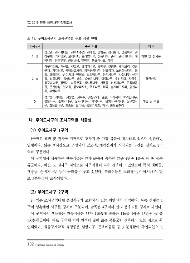2016 전국 해안사구 정밀조사 132 ? National Institute of Ecology 조사구역 주요 식물 비고 1, 3 갯그령, 갯기름나물, 갯까치수염, 갯메꽃, 갯방풍, 갯쇠보리, 갯씀바귀, 갯 장구채, 거지덩굴, 모래지치, 보리밥나무, 상동나무, 송악, 순비기나무, 예 덕나무, 참골무꽃, 큰천남성, 털머위, 통보리사초, 해국 해빈 및 전사구 2, 4 개구리발톱, 개산초, 갯그령, 갯까치수염, 갯메꽃, 갯방풍, 갯쇠보리, 갯장 구채, 거지덩굴, 곰비늘고사리, 까마귀쪽나무, 남오미자, 노랑하늘타리, 돌 외, 모래지치, 반디지치, 번행초, 보리밥나무, 붉가시나무, 사철나무, 산기 장, 상동나무, 섬향나무, 송악, 순비기나무, 예덕나무, 우산잔디, 자금우, 장구밥나무, 장딸기, 참골무꽃, 참느릅나무,...