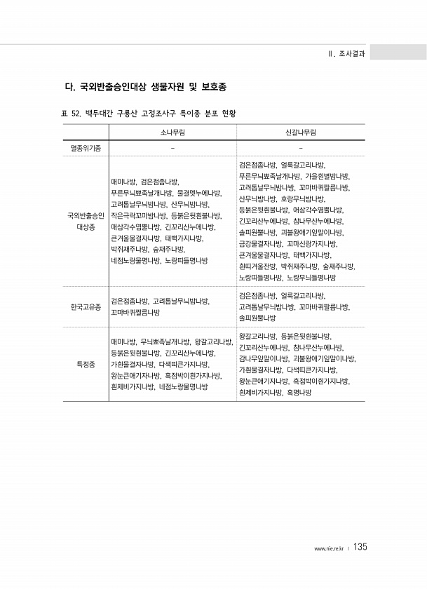 Ⅱ. 조사결과 www.nie.re.kr ? 135 다. 국외반출승인대상 생물자원 및 보호종 표 52. 백두대간 구룡산 고정조사구 특이종 분포 현황 소나무림 신갈나무림 멸종위기종 국외반출승인 대상종 매미나방, 검은점좀나방, 푸른무늬뾰족날개나방, 물결멧누에나방, 고려톱날무늬밤나방, 산무늬밤나방, 작은극락꼬마밤나방, 등붉은뒷흰불나방, 애삼각수염뿔나방, 긴꼬리산누에나방, 큰겨울물결자나방, 태백가지나방, 박쥐재주나방, 숲재주나방, 네점노랑물명나방, 노랑띠들명나방 검은점좀나방, 얼룩갈고리나방, 푸른무늬뾰족날개나방, 가을흰별밤나방, 고려톱날무늬밤나방, 꼬마바퀴짤름나방, 산무늬밤나방, 호랑무늬밤나방, 등붉은뒷흰불나방, 애삼각수염뿔나방, 긴꼬리산누에나방, 참나무산누에나방, 솔피원뿔나방, 괴불왕애기잎말이나방, 금강물결자나방,...