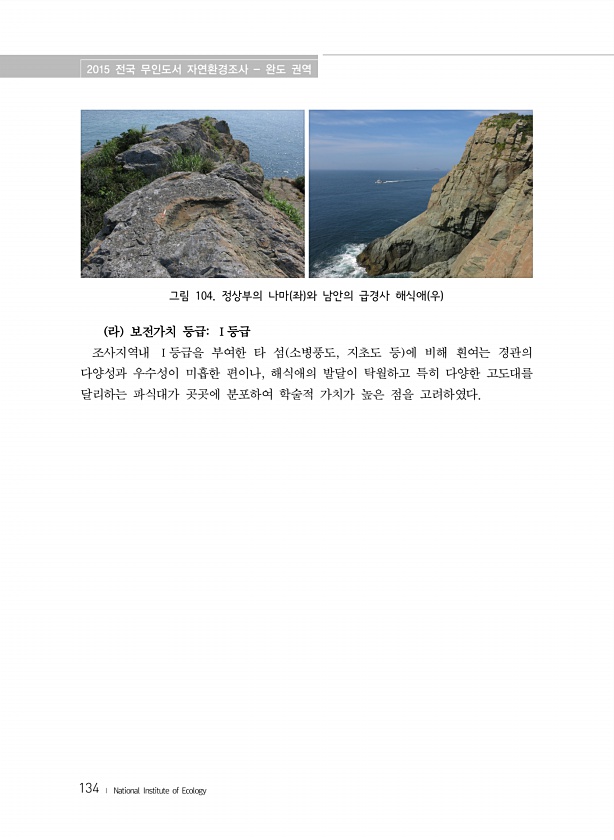 2015 전국 무인도서 자연환경조사 완도 권역 134 ? National Institute of Ecology 그림 104. 정상부의 나마 좌 와 남안의 급경사 해식애 우 라 보전가치 등급Ⅰ등급 조사지역내 Ⅰ등급을 부여한 타 섬 소병풍도, 지초도 등 에 비해 흰여는 경관의 다양성과 우수성이 미흡한 편이나, 해식애의 발달이 탁월하고 특히 다양한 고도대를 달리하는 파식대가 곳곳에 분포하여 학술적 가치가 높은 점을고려하였다.