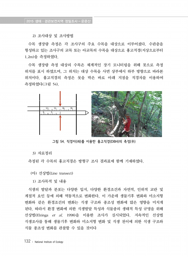 2015 생태·경관보전지역 정밀조사 운문산 132 ? National Institute of Ecology 2 조사대상 및 조사방법 수목 생장량 측정은 각 조사구의 주요 수목을 대상으로 이루어졌다. 수관층을 형성하고 있는 조사구의 교목 또는 아교목의 수목을 대상으로 흉고직경 지상으로부터 1.2m 을 측정하였다. 수목 생장량 측정 대상의 수목은 체계적인 장기 모니터링을 위해 못으로 측정 위치를 표시 하였으며, 그 위치는 대상 수목을 사면 상부에서 하부 방향으로 바라본 위치이다. 흉고직경의 측정은 못을 박은 바로 아래 지점을 직경자를 이용하여 측정하였다 그림 54 그림 54. 직경자 좌 를 이용한 흉고직경 DBH 의 측정 우 3 자료정리 측정된 각 수목의 흉고직경은 방형구 조사 결과표에 함께 기재하였다. 마 선...