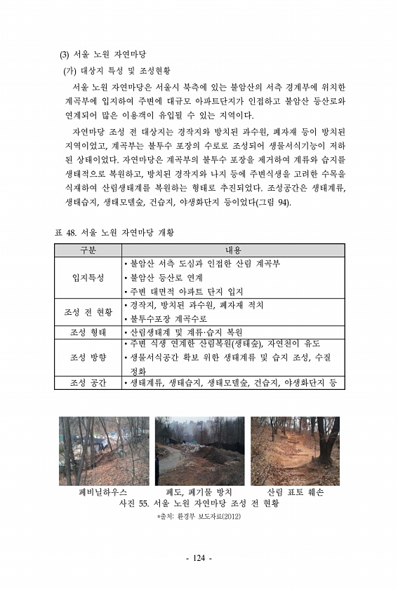 3 서울 노원 자연마당 가 대상지 특성 및 조성현황 서울 노원 자연마당은 서울시 북측에 있는 불암산의 서측 경계부에 위치한 계곡부에 입지하여 주변에 대규모 아파트단지가 인접하고 불암산 등산로와 연계되어 많은 이용객이 유입될 수 있는 지역이다. 자연마당 조성 전 대상지는 경작지와 방치된 과수원, 폐자재 등이 방치된 지역이었고, 계곡부는 불투수 포장의 수로로 조성되어 생물서식기능이 저하 된 상태이었다. 자연마당은 계곡부의 불투수 포장을 제거하여 계류와 습지를 생태적으로 복원하고, 방치된 경작지와 나지 등에 주변식생을 고려한 수목을 식재하여 산림생태계를 복원하는 형태로 추진되었다. 조성공간은 생태계류, 생태습지, 생태모델숲, 건습지, 야생화단지 등이었다 그림 94 구분 내용 입지특성 ?불암산 서측 도심과 인접한 ...