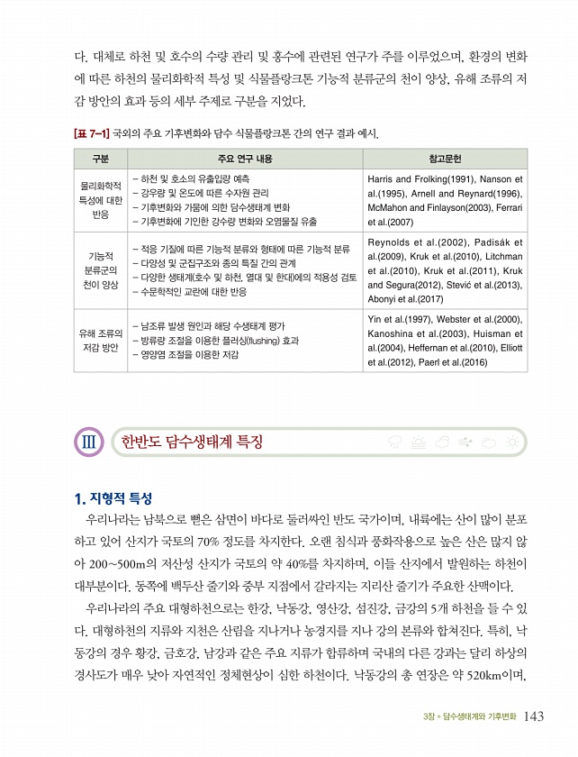 3장 담수생태계와 기후변화 143 다. 대체로 하천 및 호수의 수량 관리 및 홍수에 관련된 연구가 주를 이루었으며, 환경의 변화 에 따른 하천의 물리화학적 특성 및 식물플랑크톤 기능적 분류군의 천이 양상, 유해 조류의 저 감 방안의 효과 등의 세부 주제로 구분을 지었다. [표 7-1] 국외의 주요 기후변화와 담수 식물플랑크톤 간의 연구 결과 예시. 구분 주요 연구 내용 참고문헌 물리화학적 특성에 대한 반응 하천 및 호소의 유출입량 예측 강우량 및 온도에 따른 수자원 관리 기후변화와 가뭄에 의한 담수생태계 변화 기후변화에 기인한 강수량 변화와 오염물질 유출 Harris and Frolking 1991 , Nanson et al. 1995 , Arnell and Reynard 1996 , McMahon and ...