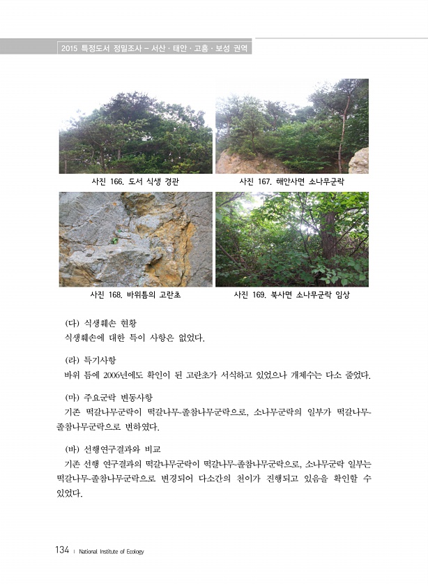 2015 특정도서 정밀조사 서산·태안·고흥·보성 권역 134 ? National Institute of Ecology 사진 166. 도서 식생 경관 사진 167. 해안사면 소나무군락 사진 168. 바위틈의 고란초 사진 169. 북사면 소나무군락 임상 다 식생훼손 현황 식생훼손에 대한 특이 사항은 없었다. 라 특기사항 바위 틈에 2006년에도 확인이 된 고란초가 서식하고 있었으나 개체수는 다소 줄었다. 마 주요군락 변동사항 기존 떡갈나무군락이 떡갈나무-졸참나무군락으로, 소나무군락의 일부가 떡갈나무- 졸참나무군락으로 변하였다. 바 선행연구결과와 비교 기존 선행 연구결과의 떡갈나무군락이 떡갈나무-졸참나무군락으로, 소나무군락 일부는 떡갈나무-졸참나무군락으로 변경되어 다소간의 천이가 진행되고 있음을 확인할 수있었다.