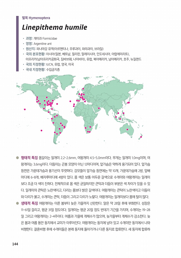 144 ● 형태적 특징 몸길이는 일개미 2.2-2.6mm, 여왕개미 4.5-5.0mm이다. 무게는 일개미 1.0mg이며, 여 왕개미는 3.6mg이다. 더듬이는 곤봉 모양이 아닌 12마디이며, 앞가슴은 약하게 융기되어 있다. 앞가슴 등면은 가운데가슴과 융기선이 뚜렷하다. 강모들이 앞가슴 등면에는 약 10개, 가운데가슴에 2쌍, 앞배 마디에 6-8개, 배자루마디에 4쌍이 있다. 몸 색은 보통 어두운 갈색으로 수개미와 여왕개미는 일개미 보다 조금 더 색이 진하다. 전체적으로 몸 색은 균일하지만 큰턱과 더듬이 부분은 색 차이가 있을 수 있 다. 일개미의 큰턱은 노란색이고, 다리는 몸보다 밝은 갈색이다. 여왕개미는 큰턱이 노란색이고 더듬이 와 다리가 붉고, 수개미는 큰턱, 더듬이 그리고 다리가 노랗다. 여왕개미는 일...
