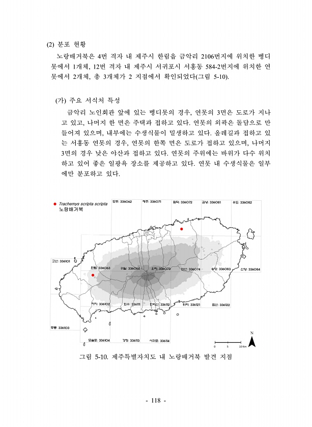 118 2 분포 현황 노랑배거북은 4번 격자 내 제주시 한림읍 금악리 2106번지에 위치한 벵디 못에서 1개체, 12번 격자 내 제주시 서귀포시 서홍동 584-2번지에 위치한 연 못에서 2개체, 총 3개체가 2 지점에서 확인되었다 그림 5-10 가 주요 서식처 특성 금악리 노인회관 앞에 있는 벵디못의 경우, 연못의 3면은 도로가 지나 고 있고, 나머지 한 면은 주택과 접하고 있다. 연못의 외곽은 돌담으로 만 들어져 있으며, 내부에는 수생식물이 밀생하고 있다. 올레길과 접하고 있 는 서홍동 연못의 경우, 연못의 한쪽 면은 도로가 접하고 있으며, 나머지 3면의 경우 낮은 야산과 접하고 있다. 연못의 주위에는 바위가 다수 위치 하고 있어 좋은 일광욕 장소를 제공하고 있다. 연못 내 수생식물은 일부 에만 분포하고 ...
