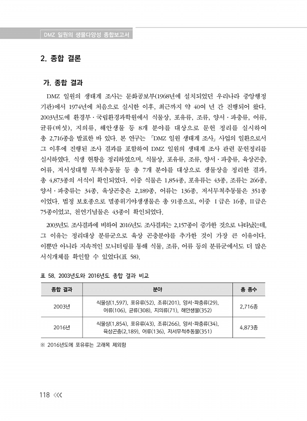 DMZ 일원의 생물다양성 종합보고서 118 2. 종합 결론 가. 종합 결과 DMZ 일원의 생태계 조사는 문화공보부 1968년에 설치되었던 우리나라 중앙행정 기관 에서 1974년에 처음으로 실시한 이후, 최근까지 약 40여 년 간 진행되어 왔다. 2003년도에 환경부·국립환경과학원에서 식물상, 포유류, 조류, 양서·파충류, 어류, 균류 버섯 , 지의류, 해안생물 등 8개 분야를 대상으로 문헌 정리를 실시하여 총 2,716종을 발표한 바 있다. 본 연구는 「DMZ 일원 생태계 조사」사업의 일환으로서 그 이후에 진행된 조사 결과를 포함하여 DMZ 일원의 생태계 조사 관련 문헌정리를 실시하였다. 식생 현황을 정리하였으며, 식물상, 포유류, 조류, 양서·파충류, 육상곤충, 어류, 저서성대형 무척추동물 등 총 7개 분...