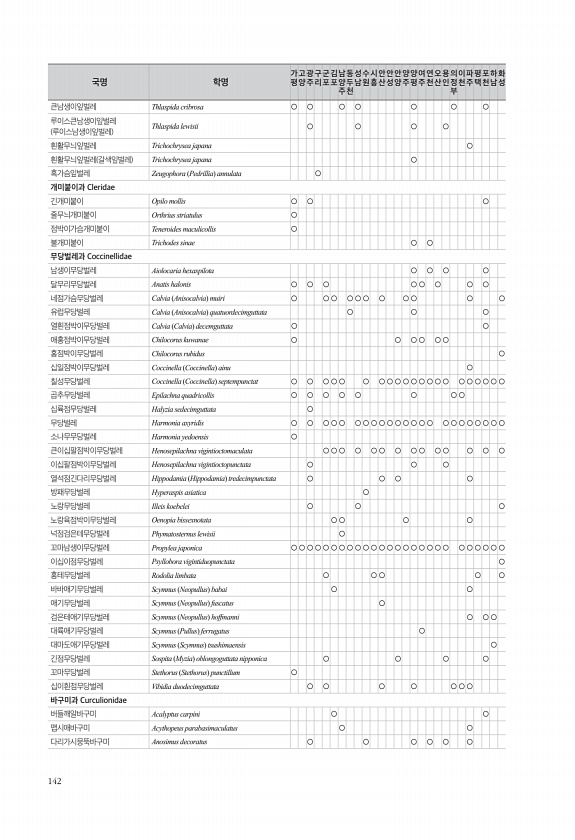 142 큰남생이잎벌레 Thlaspida cribrosa ○ ○ ○ ○ ○ ○ ○ 루이스큰남생이잎벌레 루이스남생이잎벌레 Thlaspida lewisii ○ ○ ○ ○ 흰활무늬잎벌레 Trichochrysea japana ○ 흰활무늬잎벌레 갈색잎벌레 Trichochrysea japana ○ 혹가슴잎벌레 Zeugophora Pedrillia annulata ○ 개미붙이과 Cleridae 긴개미붙이 Opilo mollis ○ ○ ○ 줄무늬개미붙이 Orthrius striatulus ○ 점박이가슴개미붙이 Teneroides maculicollis ○ 불개미붙이 Trichodes sinae ○ ○ 무당벌레과 Coccinellidae 남생이무당벌레 Aiolocaria hexaspilota ○ ○ ○ ○ 달무리무당벌레 An...