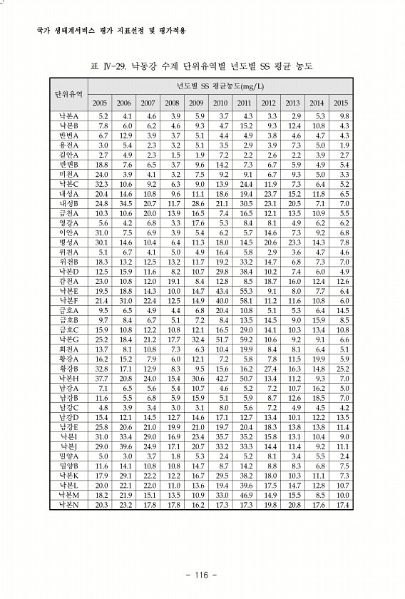 국가 생태계서비스 평가 지표선정 및 평가적용 116 단위유역 년도별 SS 평균농도 mg/L 2005 2006 2007 2008 2009 2010 2011 2012 2013 2014 2015 낙본A 5.2 4.1 4.6 3.9 5.9 3.7 4.3 3.3 2.9 5.3 9.8 낙본B 7.8 6.0 6.2 4.6 9.3 4.7 15.2 9.3 12.4 10.8 4.3 반변A 6.7 12.9 3.9 3.7 5.1 4.4 4.9 3.8 4.6 4.7 4.3 용전A 3.0 5.4 2.3 3.2 5.1 3.5 2.9 3.9 7.3 5.0 1.9 길안A 2.7 4.9 2.3 1.5 1.9 7.2 2.2 2.6 2.2 3.9 2.7 반변B 18.8 7.6 6.5 3.7 9.6 14.2 7.3 6.7 5.9 4.9 5.4 ...