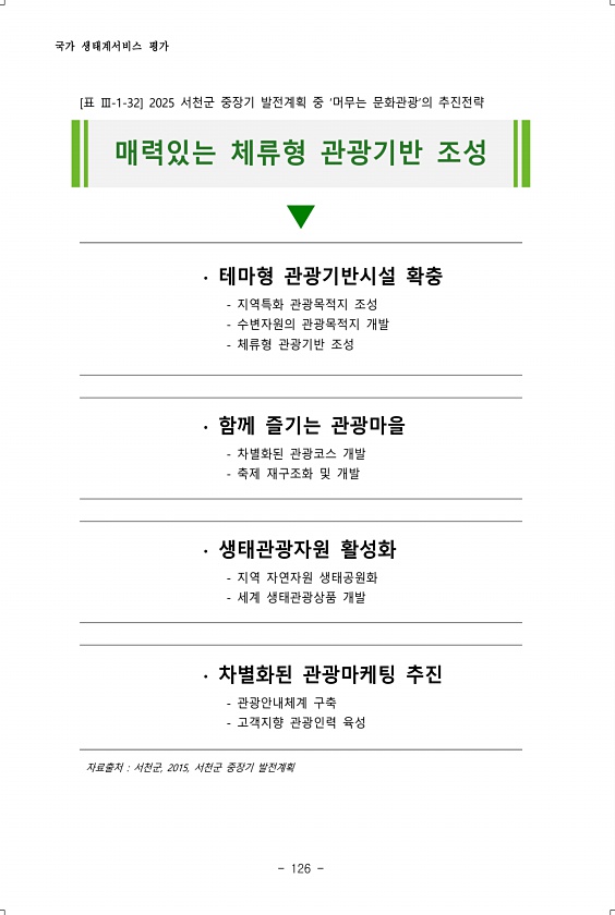 국가 생태계서비스 평가 126 매력있는 체류형 관광기반 조성 ▼ ? 테마형 관광기반시설 확충 지역특화 관광목적지 조성 수변자원의 관광목적지 개발 체류형 관광기반 조성 ? 함께 즐기는 관광마을 차별화된 관광코스 개발 축제 재구조화 및 개발 ? 생태관광자원 활성화 지역 자연자원 생태공원화 세계 생태관광상품 개발 ? 차별화된 관광마케팅 추진 관광안내체계 구축 고객지향 관광인력 육성 자료출처 서천군, 2015, 서천군 중장기 발전계획 [표 Ⅲ-1-32] 2025 서천군 중장기 발전계획 중 ‘머무는 문화관광’의추진전략