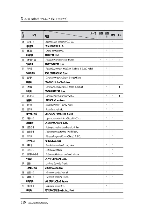 2018 특정도서 정밀조사 신안 1 남부권역 130 ? National Institute of Ecology 번 호 국명 도서명 학명 문헌 Ⅰ 문헌 Ⅱ 현지 비고 51 초피나무 Zanthoxylum piperitum L. DC. * 괭이밥과 OXALIDACEAE R. Br. 52 괭이밥 Oxalis corniculata L. * * 미나리과 APIACEAE Lindl. 53 갯기름나물 Peucedanum japonicum Thunb. * * * Ⅱ 협죽도과 APOCYNACEAE Juss. 54 마삭줄 Trachelospermum asiaticum Siebold & Zucc. Nakai * 박주가리과 ASCLEPIADACEAE Borkh. 55 산해박 Cynanchum paniculatum Bunge Kita...