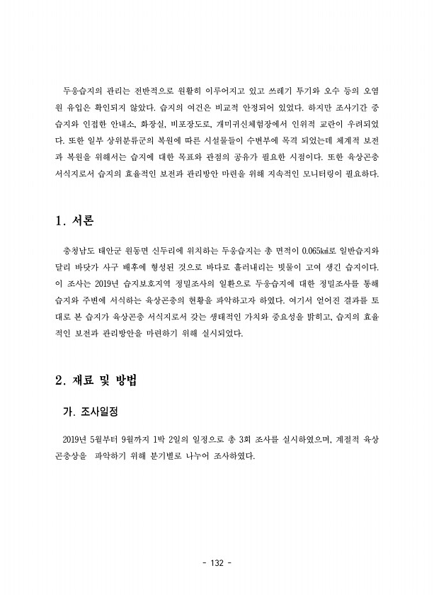132 두웅습지의 관리는 전반적으로 원활히 이루어지고 있고 쓰레기 투기와 오수 등의 오염 원 유입은 확인되지 않았다. 습지의 여건은 비교적 안정되어 있었다. 하지만 조사기간 중 습지와 인접한 안내소, 화장실, 비포장도로, 개미귀신체험장에서 인위적 교란이 우려되었 다. 또한 일부 상위분류군의 복원에 따른 시설물들이 수변부에 목격 되었는데 체계적 보전 과 복원을 위해서는 습지에 대한 목표와 관점의 공유가 필요한 시점이다. 또한 육상곤충 서식지로서 습지의 효율적인 보전과 관리방안 마련을 위해 지속적인 모니터링이 필요하다. 1. 서론 충청남도 태안군 원동면 신두리에 위치하는 두웅습지는 총 면적이 0.065㎢로 일반습지와 달리 바닷가 사구 배후에 형성된 것으로 바다로 흘러내리는 빗물이 고여 생긴 습지이다. 이 조사는...