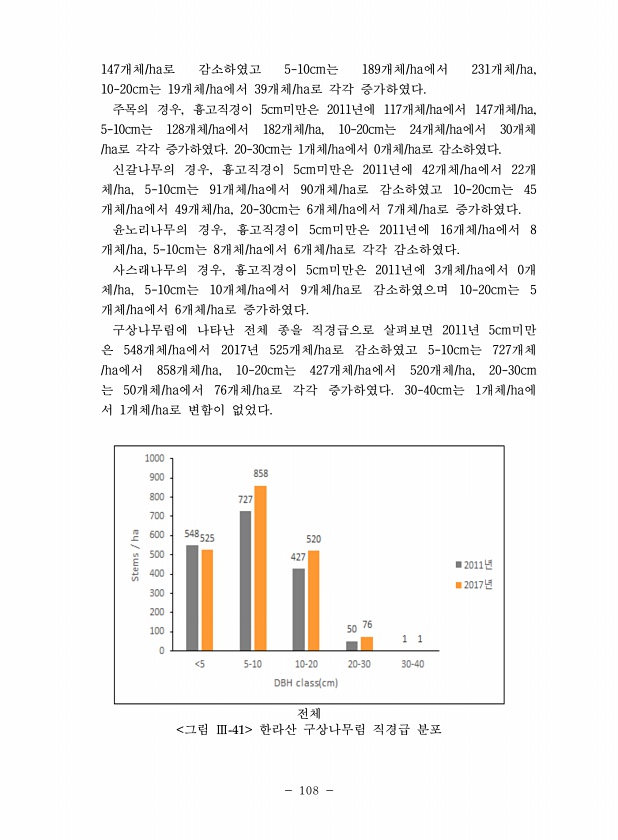 108 147개체/ha로 감소하였고 5-10cm는 189개체/ha에서 231개체/ha, 10-20cm는 19개체/ha에서 39개체/ha로 각각 증가하였다. 주목의 경우, 흉고직경이 5cm미만은 2011년에 117개체/ha에서 147개체/ha, 5-10cm는 128개체/ha에서 182개체/ha, 10-20cm는 24개체/ha에서 30개체 /ha로 각각 증가하였다. 20-30cm는 1개체/ha에서 0개체/ha로 감소하였다. 신갈나무의 경우, 흉고직경이 5cm미만은 2011년에 42개체/ha에서 22개 체/ha, 5-10cm는 91개체/ha에서 90개체/ha로 감소하였고 10-20cm는 45 개체/ha에서 49개체/ha, 20-30cm는 6개체/ha에서 7개체/ha로 증가하였다. 윤노리나무의 경우, 흉고직경이 5...