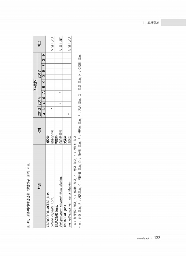 133 학명 국명 조사년도 2013 2014 2017 비고 a b c d A B C D E F G H CARYOPHYLLACEAE Juss. 석죽과 Silene capitata Kom. 분홍장구채 * Ⅴ,멸Ⅱ,VU LILIACEAE Juss. 백합과 Polygonatum stenophyllum Maxim. 층층둥굴레 * * Ⅴ,멸Ⅱ,NT IRIDACEAE Juss. 붓꽃과 Iris ruthenica var. nana Maixim. 솔붓꽃 * Ⅳ,멸Ⅱ,VU 표 45. 멸종위기야생생물 선행연구 결과 비교 a 철원평야 일대, b 성제산 일대, c 빙애 일대, d 천덕산 일대 A 빙애 코스, B 사동코스, C 덕현골 코스, D 덕산리 코스, E 산명호 코스, F 동송 코스, G 토교 코스, H 이길리코스