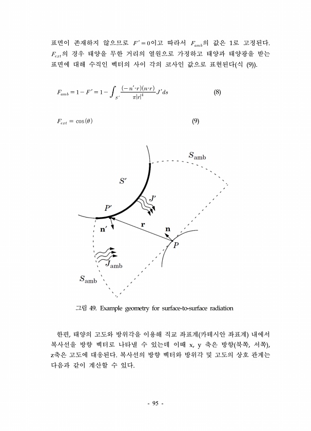 95 표면이 존재하지 않으므로 ′ 이고 따라서 ???의 값은 1로 고정된다. ???의 경우 태양을 무한 거리의 열원으로 가정하고 태양과 태양광을 받는 표면에 대해 수직인 벡터의 사이 각의 코사인 값으로 표현된다 식 9 ??? ′ ′ ? ?′·??·? ′?? 8 ??? cos 9 그림 49. Example geometry for surface-to-surface radiation 한편, 태양의 고도와 방위각을 이용해 직교 좌표계 카테시안 좌표계 내에서 복사선을 방향 벡터로 나타낼 수 있는데 이때 x, y 축은 방향 북쪽, 서쪽 , z축은 고도에 대응된다. 복사선의 방향 벡터와 방위각 및 고도의 상호 관계는 다음과 같이 계산할...