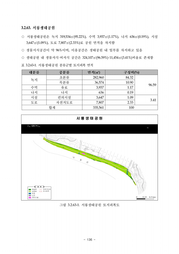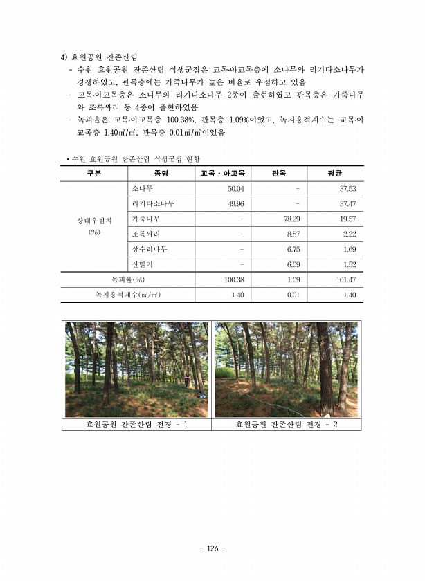 126 4 효원공원 잔존산림 수원 효원공원 잔존산림 식생군집은 교목?아교목층에 소나무와 리기다소나무가 경쟁하였고, 관목층에는 가죽나무가 높은 비율로 우점하고 있음 교목?아교목층은 소나무와 리기다소나무 2종이 출현하였고 관목층은 가죽나무 와 조록싸리 등 4종이 출현하였음 녹피율은 교목?아교목층 100.38%, 관목층 1.09%이었고, 녹지용적계수는 교목?아 교목층 1.40㎥/㎡, 관목층 0.01㎥/㎡이었음 ?수원 효원공원 잔존산림 식생군집 현황 구분 종명 교목?아교목 관목 평균 상대우점치 % 소나무 50.04 37.53 리기다소나무 49.96 37.47 가죽나무 78.29 19.57 조록싸리 8.87 2.22 상수리나무 6.75 1.69 산딸기 6.09 1.52 녹피율 % 100.38 1.09 101.47 녹...