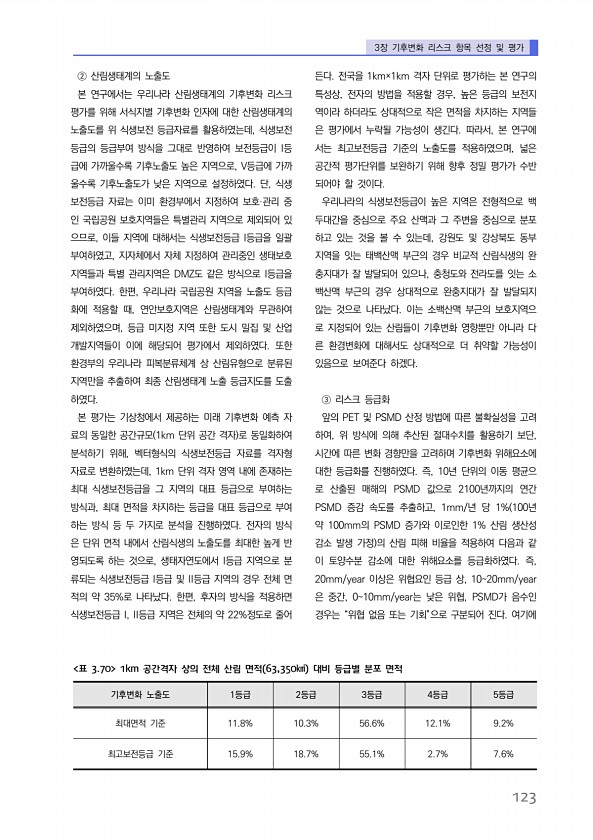 3장 기후변화 리스크 항목 선정 및 평가 123 ② 산림생태계의 노출도 본 연구에서는 우리나라 산림생태계의 기후변화 리스크 평가를 위해 서식지별 기후변화 인자에 대한 산림생태계의 노출도를 위 식생보전 등급자료를 활용하였는데, 식생보전 등급의 등급부여 방식을 그대로 반영하여 보전등급이 I등 급에 가까울수록 기후노출도 높은 지역으로, V등급에 가까 울수록 기후노출도가 낮은 지역으로 설정하였다. 단, 식생 보전등급 자료는 이미 환경부에서 지정하여 보호·관리 중 인 국립공원 보호지역들은 특별관리 지역으로 제외되어 있 으므로, 이들 지역에 대해서는 식생보전등급 I등급을 일괄 부여하였고, 지자체에서 자체 지정하여 관리중인 생태보호 지역들과 특별 관리지역은 DMZ도 같은 방식으로 I등급을 부여하였다. 한편, 우리나라 국...