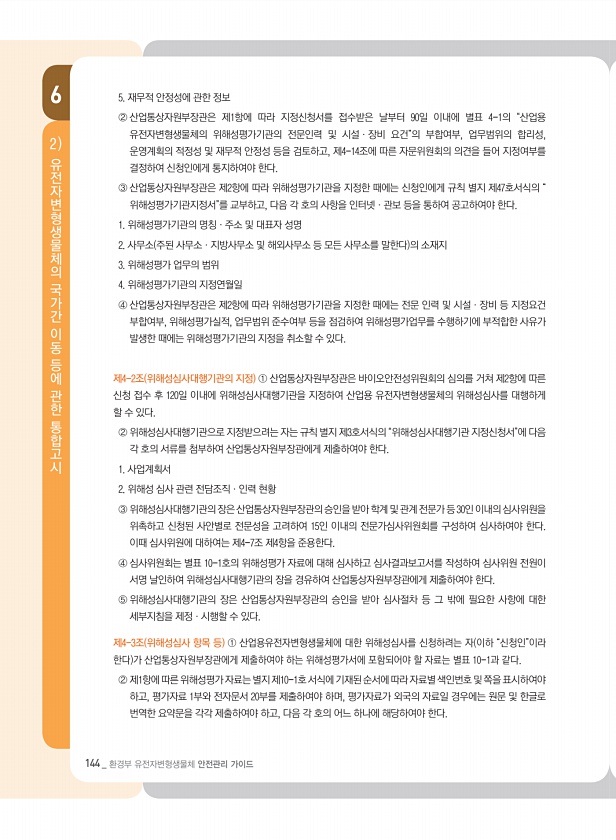 144 _ 환경부 유전자변형생물체 안전관리 가이드 6 유전자변형생물체의 국가간 이동 등에 관한 통합고시 2 5. 재무적 안정성에 관한 정보 ② 산업통상자원부장관은 제1항에 따라 지정신청서를 접수받은 날부터 90일 이내에 별표 4-1의 “산업용 유전자변형생물체의 위해성평가기관의 전문인력 및 시설·장비 요건”의 부합여부, 업무범위의 합리성, 운영계획의 적정성 및 재무적 안정성 등을 검토하고, 제4-14조에 따른 자문위원회의 의견을 들어 지정여부를 결정하여 신청인에게 통지하여야 한다. ③ 산업통상자원부장관은 제2항에 따라 위해성평가기관을 지정한 때에는 신청인에게 규칙 별지 제47호서식의 “ 위해성평가기관지정서”를 교부하고, 다음 각 호의 사항을 인터넷·관보 등을 통하여 공고하여야 한다. 1. 위해성평가기관의 명칭...