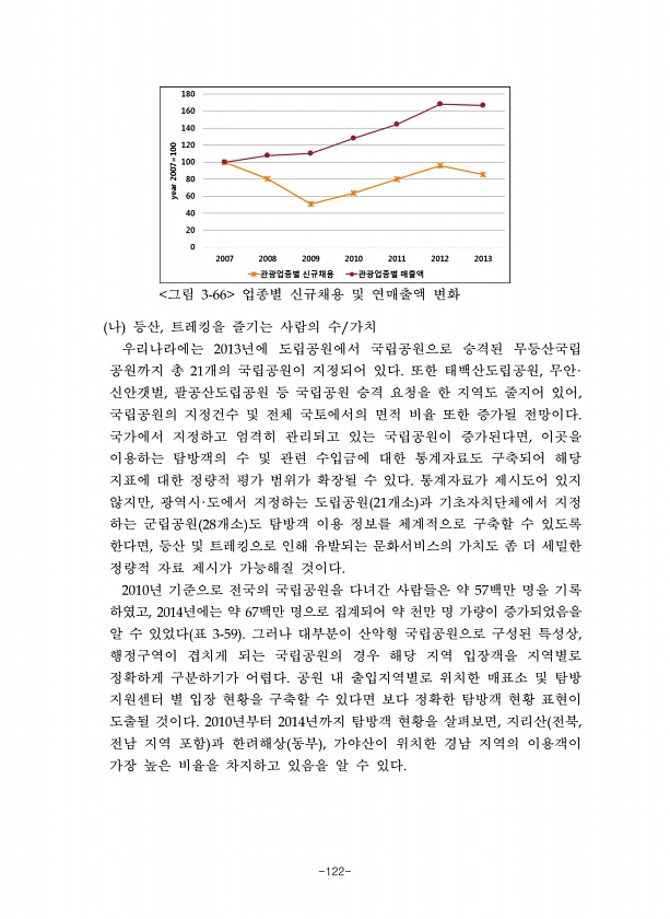 -122- 그림 업종별 신규채용 및 연매출액 변화 나 등산 트레킹을 즐기는 사람의 수 가치 우리나라에는 년에 도립공원에서 국립공원으로 승격된 무등산국립 공원까지 총 개의 국립공원이 지정되어 있다 또한 태백산도립공원 무안 신안갯벌 팔공산도립공원 등 국립공원 승격 요청을 한 지역도 줄지어 있어 국립공원의 지정건수 및 전체 국토에서의 면적 비율 또한 증가될 전망이다 국가에서 지정하고 엄격히 관리되고 있는 국립공원이 증가된다면 이곳을 이용하는 탐방객의 수 및 관련 수입금에 대한 통계자료도 구축되어 해당 지표에 대한 정량적 평가 범위가 확장될 수 있다 통계자료가 제시도어 있지 않지만 광역시 도에서 지정하는 도립공원 개소 과 기초자치단체에서 지정 하는 군립공원 개소 도 탐방객 이용 정보를 체계적으로 구축할 수 있도록 ...