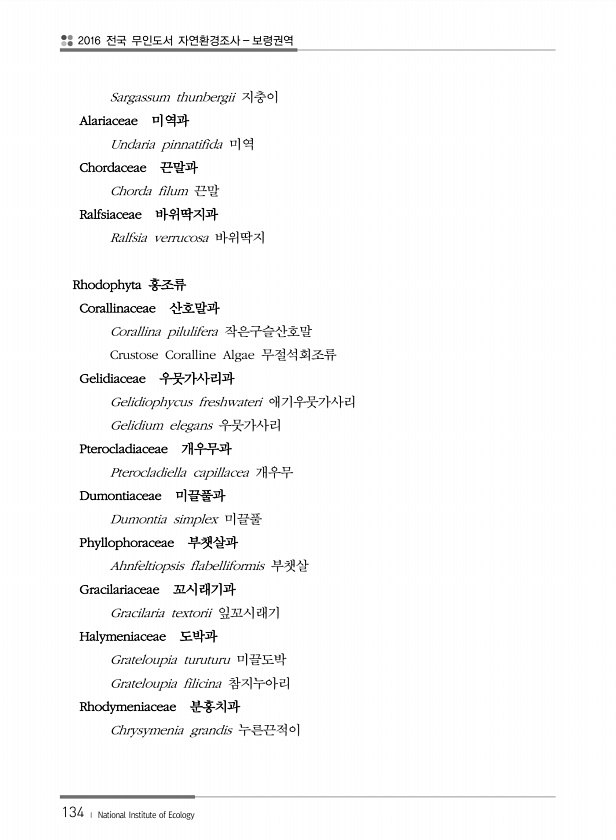 2016 전국 무인도서 자연환경조사 보령권역 134 ? National Institute of Ecology Sargassum thunbergii 지충이 Alariaceae 미역과 Undaria pinnatifida 미역 Chordaceae 끈말과 Chorda filum 끈말 Ralfsiaceae 바위딱지과 Ralfsia verrucosa 바위딱지 Rhodophyta 홍조류 Corallinaceae 산호말과 Corallina pilulifera 작은구슬산호말 Crustose Coralline Algae 무절석회조류 Gelidiaceae 우뭇가사리과 Gelidiophycus freshwateri 애기우뭇가사리 Gelidium elegans 우뭇가사리 Pterocladiaceae 개우무과 Pterocladiel...