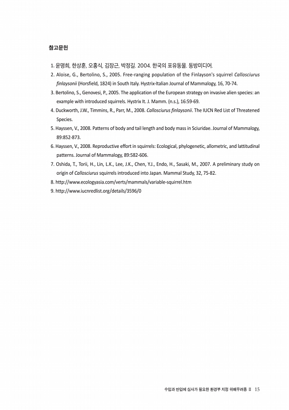 수입과 반입에 심사가 필요한 환경부 지정 위해우려종 Ⅱ 15 참고문헌 1. 윤명희, 한상훈, 오홍식, 김장근, 박정길. 2004. 한국의 포유동물. 동방미디어. 2. Aloise, G., Bertolino, S., 2005. Free-ranging population of the Finlaysons squirrel Callosciurus finlaysonii Horsfield, 1824 in South Italy. Hystrix-Italian Journal of Mammalogy, 16, 70-74. 3. Bertolino, S., Genovesi, P., 2005. The application of the European strategy on invasive alien speciesan example wi...