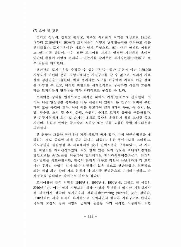112 7 요약 및 결론 경기도 성남시, 강원도 평창군, 제주도 서귀포시 지역을 대상으로 1910년 대부터 2016년까지 100년간 토지이용이 어떻게 변해왔는지를 추적하고 이를 분석하였다. 토지이용이란 지표가 현재 무엇으로, 또는 어떤 상태로 이용되 고 있는지를 말하며, 이는 결국 토지이용 자체가 일정한 자연환경 속에서 인간의 활동이 어떻게 전개되고 있는지를 알려주는 지시경관 指示景觀 이 될 수 있음을 의미한다. 백년간의 토지이용을 추적할 수 있는 근거는 일반 문헌이 아닌 1;50,000 지형도가 마련해 준다. 지형도에서는 지질구조를 알 수 없으며, 오리지 지표 상의 경관만을 표출한다. 이때 범례라는 도구를 이용하여 지표의 이용 상태 를 가늠할 수 있고, 이러한 지형도를 시계열적으로 구축하면 시간의 흐름에 ...