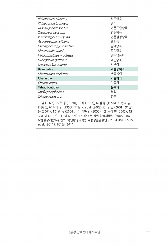 낙동강 담수생태계의 주인 143 Rhinogobius giurinus 갈문망둑 Rhinogobius brunneus 밀어 Tridentiger bifasciatus 민물두줄망둑 Tridentiger obscurus 검정망둑 # Tridentiger brevispinis 민물검정망둑 Acentrogobius pflaumi 줄망둑 Favonigobius gymnauchen 날개망둑 Mugilogobius abei 모치망둑 Periophthalmus modestus 말뚝망둥어 Luciogobius guttatus 미끈망둑 Leucopsarion petersii 사백어 Belontiidae 버들붕어과 Macropodus ocellatus 버들붕어 Channidae 가물치과 Channa argus 가물치 Tetrao...
