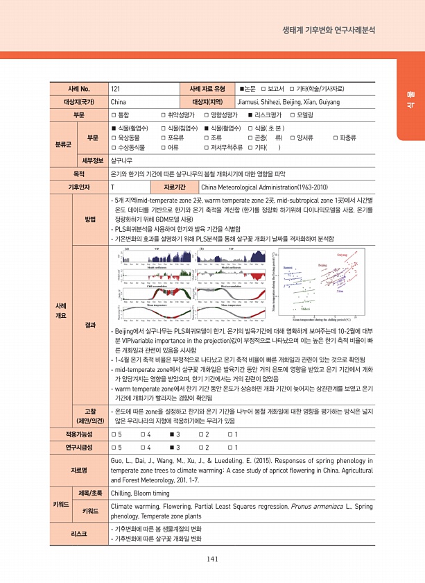 141 생태계 기후변화 연구사례분석 식 물 사례 No. 121 사례 자료 유형 ■논문 □ 보고서 □ 기타 학술/기사자료 대상지 국가 China 대상지 지역 Jiamusi, Shihezi, Beijing, Xi’an, Guiyang 부문 □ 통합 □ 취약성평가 □ 영향성평가 ■ 리스크평가 □ 모델링 분류군 부문 ■ 식물 활엽수 □ 식물 침엽수 ■ 식물 활엽수 □ 식물 초 본 □ 육상동물 □ 포유류 □ 조류 □ 곤충 류 □ 양서류 □ 파충류 □ 수상동식물 □ 어류 □ 저서무척추류 □ 기타 세부정보 살구나무 목적 온기와 한기의 기간에 따른 살구나무의 봄철 개화시기에 대한 영향을 파악 기후인자 T 자료기간 China Meteorological Administration 1963-2010 사례 개요 방법 5개 지역 ...