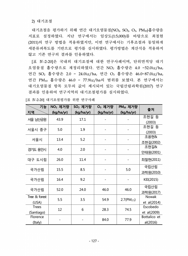 2 대기조절 대기조절을 평가하기 위해 연간 대기오염물질 NO2, SO2, O3, PM10 흡수량을 지표로 설정하였다. 지난 연구에서는 임상도 15,000 를 바탕으로 최철현 2011 의 연구 방법을 적용하였지만, 이번 연구에서는 기후조절과 동일하게 세분류피복도를 기반으로 평가를 실시하였다. 평가방법은 계산식을 적용하지 않고 기존 연구의 결과를 인용하였다. [표 Ⅳ-2-20]은 국내외 대기조절에 대한 연구사례이며, 단위면적당 대기 오염물질 흡수량으로 재정리하였다. 연간 NO2 흡수량은 4.0 52.0㎏/ha, 연간 SO2 흡수량은 2.0 24.0㎏/ha, 연간 O3 흡수량은 46.087.0㎏/ha, 연간 PM10 흡수량은 46.0 77.9㎏/ha의 범위를 보였다. 본 연구에서는 대기오염물질 항목 모두의 값이 ...