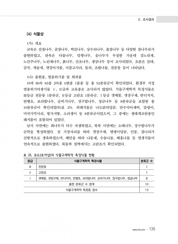 Ⅱ. 조사결과 www.nie.re.kr ? 135 4 식물상 가 개요 교목은 갈참나무, 굴참나무, 떡갈나무, 상수리나무, 졸참나무 등 다양한 참나무류가 출현하였고, 관목은 다릅나무, 덜꿩나무, 음나무가 우점한 가운데 검노린재, 노간주나무, 노린재나무, 붉나무, 산초나무, 생강나무 등이 조사되었다. 초본은 갈대, 감국, 개솔새, 갯강아지풀, 넉줄고사리, 돌피, 조밥나물, 천문동 등이 나타났다. 나 출현종, 멸종위기종 및 희귀종 45과 80속 83종 2아종 6변종 1품종 등 총 92분류군이 확인되었다. 환경부 지정 멸종위기야생식물 Ⅰ, Ⅱ급과 고유종은 조사되지 않았다. 식물구계학적 특정식물은 Ⅲ등급 천문동 1분류군, Ⅱ등급 고란초 1분류군, Ⅰ등급 갯메꽃, 갯장구채, 반디지치, 번행초, 보리밥나무, 순비기나무,...