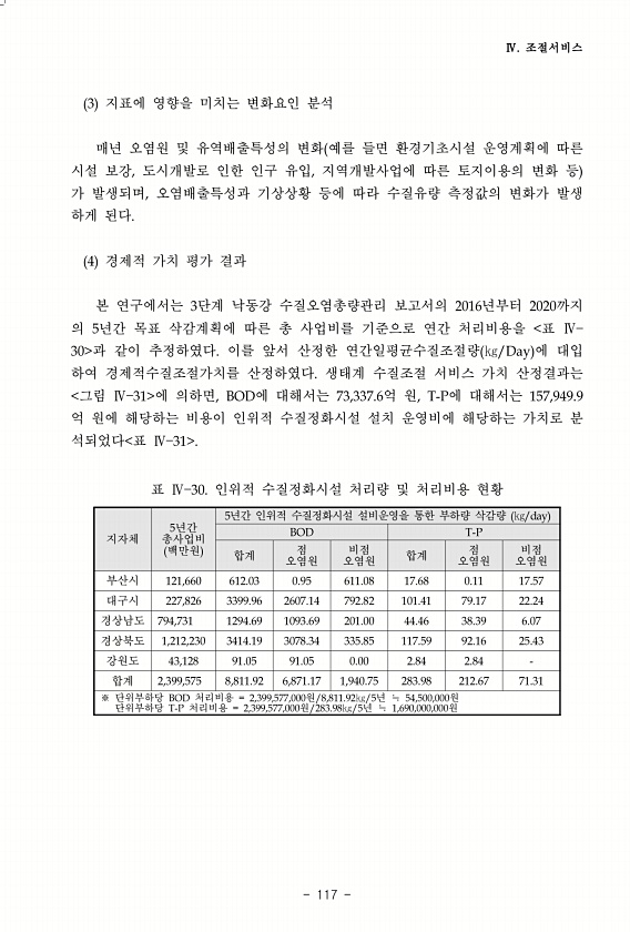 Ⅳ. 조절서비스 117 3 지표에 영향을 미치는 변화요인 분석 매년 오염원 및 유역배출특성의 변화 예를 들면 환경기초시설 운영계획에 따른 시설 보강, 도시개발로 인한 인구 유입, 지역개발사업에 따른 토지이용의 변화 등 가 발생되며, 오염배출특성과 기상상황 등에 따라 수질유량 측정값의 변화가 발생 하게 된다. 4 경제적 가치 평가 결과 본 연구에서는 3단계 낙동강 수질오염총량관리 보고서의 2016년부터 2020까지 의 5년간 목표 삭감계획에 따른 총 사업비를 기준으로 연간 처리비용을 표 Ⅳ 30 과 같이 추정하였다. 이를 앞서 산정한 연간일평균수질조절량 ㎏/Day 에 대입 하여 경제적수질조절가치를 산정하였다. 생태계 수질조절 서비스 가치 산정결과는 그림 Ⅳ 31 에 의하면, BOD에 대해서는 73,337.6억...