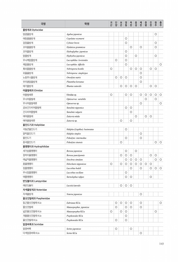 143 물방개과 Dytiscidae 땅콩물방개 Agabus japonicus ○ 애등줄물방개 Copelatus weymarni ○ 검정물방개 Cybister brevis ○ ○ 꼬마줄물방개 Hydaticus grammicus ○ ○ ○ 꼬마물방개 Hydroglyphus japonicus ○ 알물방개 Hyphydrus japonicus ○ ○ ○ 무늬깨알물방개 Laccophilius lewisioides ○ ○ 깨알물방개 Laccophilus diffcilis ○ ○ 혹외줄물방개 Nebrioporus hostilis ○ ○ ○ ○ ○ ○ 외줄물방개 Nebrioporus simplicipes ○ 노랑무늬물방개 Oreodytes natrix ○ ○ ○ ○ 우리콩알물방개 Platambus koreanus ○ 애기물...