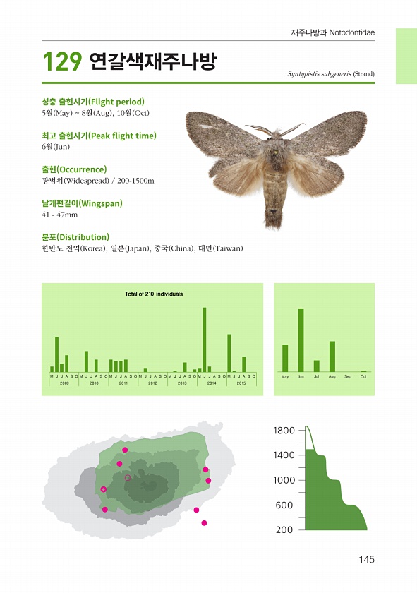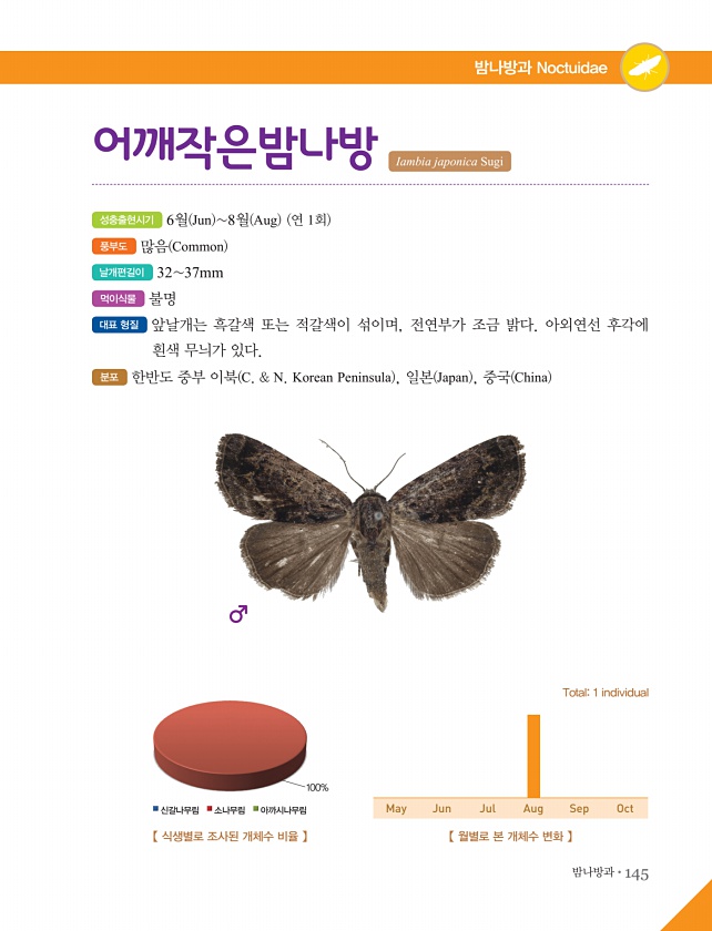 밤나방과?145 밤나방과 Noctuidae 성충출현시기 6월 Jun 8월 Aug 연 1회 풍부도 많음 Common 날개편길이 3237mm 먹이식물 불명 대표 형질 앞날개는 흑갈색 또는 적갈색이 섞이며, 전연부가 조금 밝다. 아외연선 후각에 흰색 무늬가 있다. 분포 한반도 중부 이북 C. & N. Korean Peninsula , 일본 Japan , 중국 China 어깨작은밤나방 Iambia japonica Sugi 【 월별로 본 개체수 변화 】 Total1 individual May Jun Jul Aug Sep Oct 【 식생별로 조사된 개체수 비율 】 100% 신갈나무림 소나무림아까시나무림