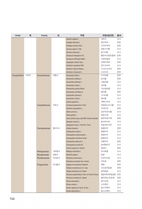 144 Senecio vulgaris L. 개쑥갓 조사 Solidago altissima L. 양미역취 문헌 Solidago serotina Aiton 미국미역취 문헌 Sonchus asper L. Hill. 큰방가지똥 조사 Sonchus oleraceus L. 방가지똥 조사 Taraxacum laevigatum DC. 붉은씨서양민들레 문헌 Taraxacum offcinale Weber 서양민들레 조사 Tragopogon dubius Scop. 쇠채아재비 문헌 Xanthium canadense Mill. 큰도꼬마리 조사 Xanthium italicum Moore. 가시도꼬마리 문헌 Xanthium strumarium L. 도꼬마리 문헌 Caryophyllales 석죽목 Amaranthaceae 비름과 Ama...