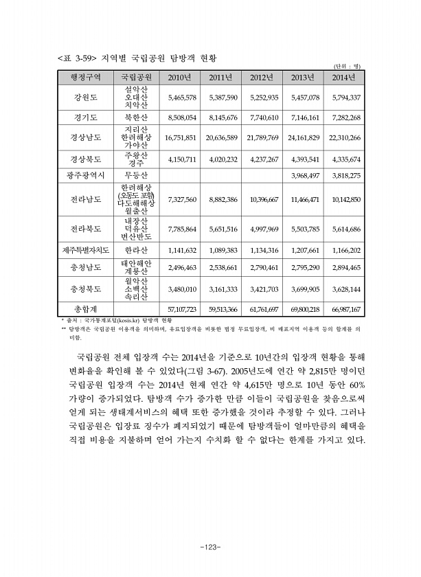 -123- 단위 명 행정구역 국립공원 년 년 년 년 년 강원도 설악산 오대산 치악산 경기도 북한산 경상남도 지리산 한려해상 가야산 경상북도 주왕산 경주 광주광역시 무등산 전라남도 한려해상 오동도포함 다도해해상 월출산 전라북도 내장산 덕유산 변산반도 제주특별자치도 한라산 충청남도 태안해안 계룡산 충청북도 월악산 소백산 속리산 총합계 출처 국가통계포털 탐방객 현황 탐방객은 국립공원 이용객을 의미하며 유료입장객을 비롯한 법정 무료입장객 비 매표지역 이용객 등의 합계를 의 미함 표 지역별 국립공원 탐방객 현황 국립공원 전체 입장객 수는 년을 기준으로 년간의 입장객 현황을 통해 변화율을 확인해 볼 수 있었다 그림 년도에 연간 약 만 명이던 국립공원 입장객 수는 년 현재 연간 약 만 명으로 년 동안 가량이 증가되었다 ...