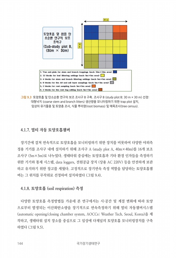 144 국가장기생태연구 그림 9.3 토양호흡 및 탄소순환 연구의 보조 조사구 B 구축. 조사구 B study plot B; 30 m × 30 m 선정대형낙지 coarse stem and branch litters 생산량을 모니터링하기 위한 trap plot 설치, 임상의 유기물층 및 토양층 조사, 식물 뿌리량 root biomass 및 매목조사 tree census 4.1.7. 멀티 자동 토양호흡챔버 장기간에 걸쳐 연속적으로 토양호흡을 모니터링하기 위한 장치를 비롯하여 다양한 야외측 정용 기기를 조사구 내에 설치하기 위해 조사구 A study plot A, 40m×40m 를 16개 보조 조사구 5m×5m 로 나누었다. 생태타워 중심에는 토양호흡과 기타 환경 인자들을 측정하기 위한 기기와 통제 시스템, dat...