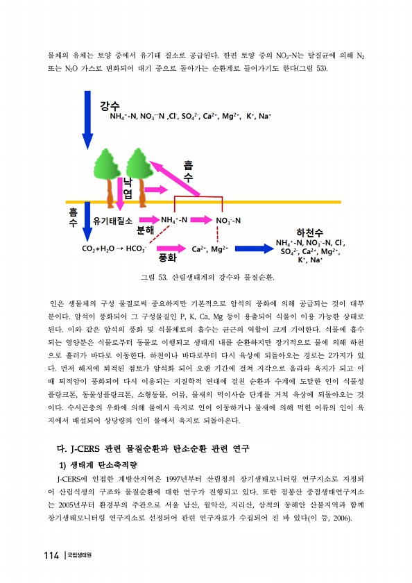 물체의 유체는 토양 중에서 유기태 질소로 공급된다. 한편 토양 중의 NO3-N는 탈질균에 의해 N2 또는 N2O 가스로 변화되어 대기 중으로 돌아가는 순환계로 들어가기도 한다 그림 53 그림 53. 산림생태계의 강수와 물질순환. 인은 생물체의 구성 물질로써 중요하지만 기본적으로 암석의 풍화에 의해 공급되는 것이 대부 분이다. 암석이 풍화되어 그 구성물질인 P, K, Ca, Mg 등이 용출되어 식물이 이용 가능한 상태로 된다. 이와 같은 암석의 풍화 및 식물체로의 흡수는 균근의 역할이 크게 기여한다. 식물에 흡수 되는 영양분은 식물로부터 동물로 이행되고 생태계 내를 순환하지만 장기적으로 물에 의해 하천 으로 흘러가 바다로 이동한다. 하천이나 바다로부터 다시 육상에 되돌아오는 경로는 2가지가 있 다. 먼저 해저...