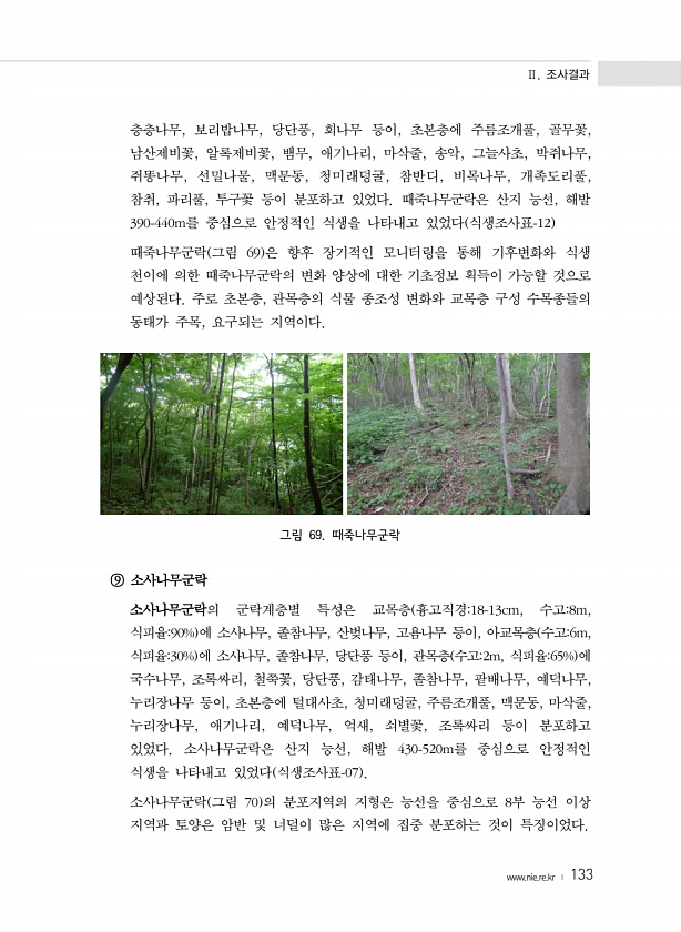 Ⅱ. 조사결과 www.nie.re.kr ? 133 층층나무, 보리밥나무, 당단풍, 회나무 등이, 초본층에 주름조개풀, 골무꽃, 남산제비꽃, 알록제비꽃, 뱀무, 애기나리, 마삭줄, 송악, 그늘사초, 박쥐나무, 쥐똥나무, 선밀나물, 맥문동, 청미래덩굴, 참반디, 비목나무, 개족도리풀, 참취, 파리풀, 투구꽃 등이 분포하고 있었다. 때죽나무군락은 산지 능선, 해발 390-440m를 중심으로 안정적인 식생을 나타내고 있었다 식생조사표-12 때죽나무군락 그림 69 은 향후 장기적인 모니터링을 통해 기후변화와 식생 천이에 의한 때죽나무군락의 변화 양상에 대한 기초정보 획득이 가능할 것으로 예상된다. 주로 초본층, 관목층의 식물 종조성 변화와 교목층 구성 수목종들의 동태가 주목, 요구되는 지역이다. 그림 69. 때죽나무...