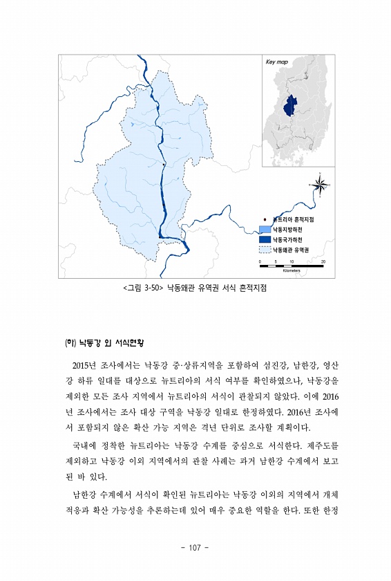 ? ? ? ?? ? ?? 2015년 조사에서는 낙동강 중·상류지역을 포함하여 섬진강, 남한강, 영산 강 하류 일대를 대상으로 뉴트리아의 서식 여부를 확인하였으나, 낙동강을 제외한 모든 조사 지역에서 뉴트리아의 서식이 관찰되지 않았다. 이에 2016 년 조사에서는 조사 대상 구역을 낙동강 일대로 한정하였다. 2016년 조사에 서 포함되지 않은 확산 가능 지역은 격년 단위로 조사할 계획이다. 국내에 정착한 뉴트리아는 낙동강 수계를 중심으로 서식한다. 제주도를 제외하고 낙동강 이외 지역에서의 관찰 사례는 과거 남한강 수계에서 보고 된 바 있다. 남한강 수계에서 서식이 확인된 뉴트리아는 낙동강 이외의 지역에서 개체 적응과 확산 가능성을 추론하는데 있어 매우 중요한 역할을 한다. 또한한정