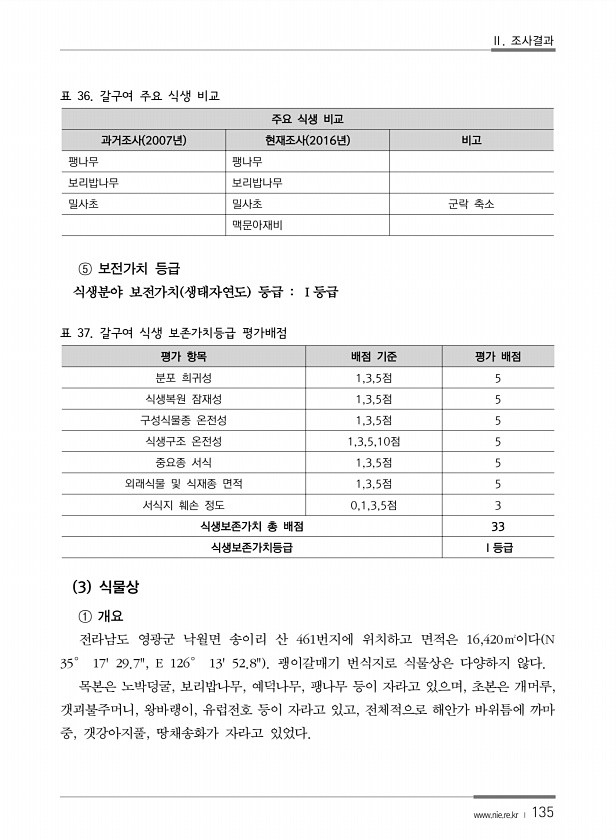 Ⅱ. 조사결과 www.nie.re.kr ? 135 표 36. 갈구여 주요 식생 비교 주요 식생 비교 과거조사 2007년 현재조사 2016년 비고 팽나무 팽나무 보리밥나무 보리밥나무 밀사초 밀사초 군락 축소 맥문아재비 ⑤ 보전가치 등급 식생분야 보전가치 생태자연도 등급 Ⅰ등급 표 37. 갈구여 식생 보존가치등급 평가배점 평가 항목 배점 기준 평가 배점 분포 희귀성 1,3,5점 5 식생복원 잠재성 1,3,5점 5 구성식물종 온전성 1,3,5점 5 식생구조 온전성 1,3,5,10점 5 중요종 서식 1,3,5점 5 외래식물 및 식재종 면적 1,3,5점 5 서식지 훼손 정도 0,1,3,5점 3 식생보존가치 총 배점 33 식생보존가치등급 Ⅰ등급 3 식물상 ① 개요 전라남도 영광군 낙월면 송이리 산 461번지에 위치하고...