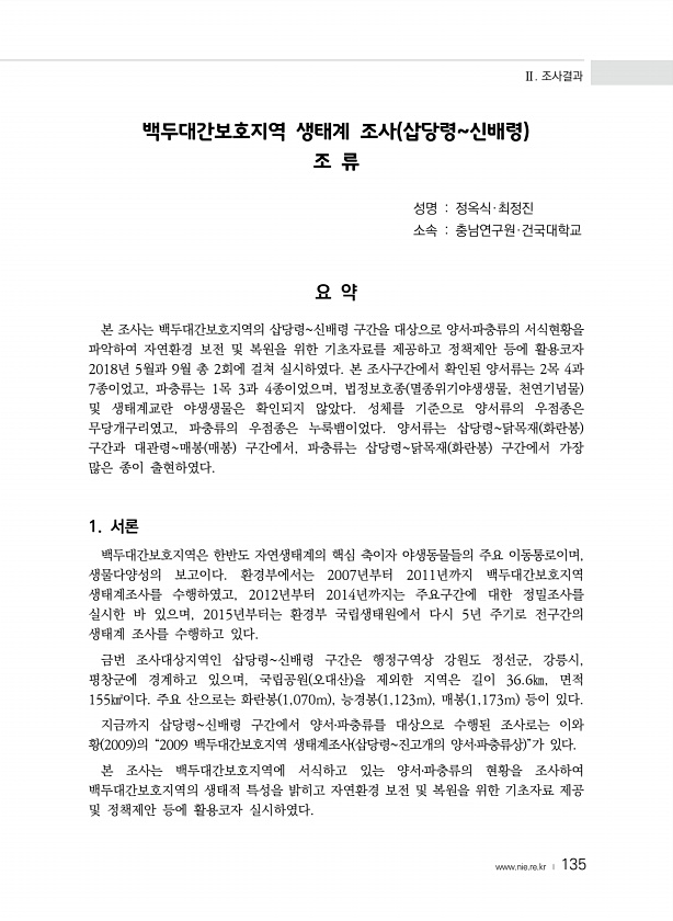 Ⅱ. 조사결과 www.nie.re.kr ? 135 백두대간보호지역 생태계 조사 삽당령신배령 조 류 성명 정옥식·최정진 소속 충남연구원·건국대학교 요 약 본 조사는 백두대간보호지역의 삽당령신배령 구간을 대상으로 양서?파충류의 서식현황을 파악하여 자연환경 보전 및 복원을 위한 기초자료를 제공하고 정책제안 등에 활용코자 2018년 5월과 9월 총 2회에 걸쳐 실시하였다. 본 조사구간에서 확인된 양서류는 2목 4과 7종이었고, 파충류는 1목 3과 4종이었으며, 법정보호종 멸종위기야생생물, 천연기념물 및 생태계교란 야생생물은 확인되지 않았다. 성체를 기준으로 양서류의 우점종은 무당개구리였고, 파충류의 우점종은 누룩뱀이었다. 양서류는 삽당령닭목재 화란봉 구간과 대관령매봉 매봉 구간에서, 파충류는 삽당령닭목재 화란봉 구...