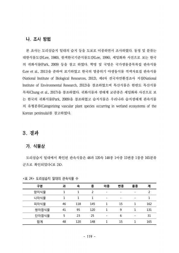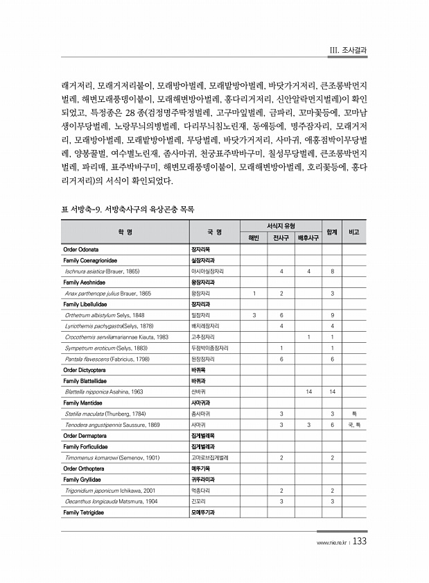 III. 조사결과 www.nie.re.kr ?133 래거저리, 모래거저리붙이, 모래방아벌레, 모래밭방아벌레, 바닷가거저리, 큰조롱박먼지 벌레, 해변모래풍뎅이붙이, 모래해변방아벌레, 홍다리거저리, 신안알락먼지벌레 이 확인 되었고, 특정종은 28 종 검정명주딱정벌레, 고구마잎벌레, 금파리, 꼬마꽃등에, 꼬마남 생이무당벌레, 노랑무늬의병벌레, 다리무늬침노린재, 동애등에, 명주잠자리, 모래거저 리, 모래방아벌레, 모래밭방아벌레, 무당벌레, 바닷가거저리, 사마귀, 애홍점박이무당벌 레, 양봉꿀벌, 여수별노린재, 좀사마귀, 천궁표주박바구미, 칠성무당벌레, 큰조롱박먼지 벌레, 파리매, 표주박바구미, 해변모래풍뎅이붙이, 모래해변방아벌레, 호리꽃등에, 홍다 리거저리 의 서식이 확인되었다. 학 명 국 명 서식지 유형 합계 비고...