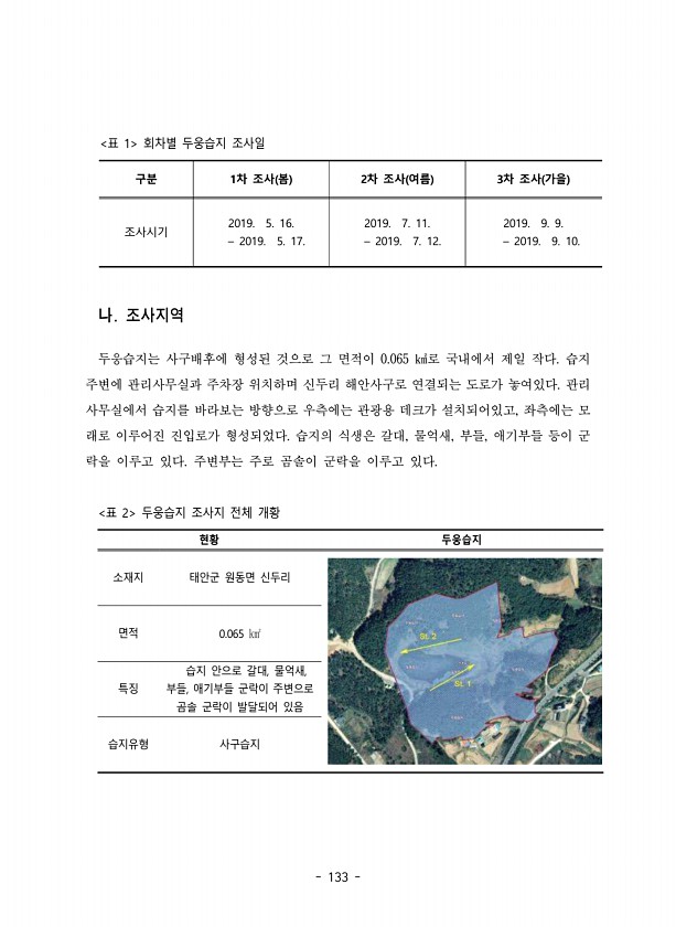 133 구분 1차 조사 봄 2차 조사 여름 3차 조사 가을 조사시기 2019. 5. 16. ? 2019. 5. 17. 2019. 7. 11. ? 2019. 7. 12. 2019. 9. 9. ? 2019. 9. 10. 표 1 회차별 두웅습지 조사일 나. 조사지역 두웅습지는 사구배후에 형성된 것으로 그 면적이 0.065 ㎢로 국내에서 제일 작다. 습지 주변에 관리사무실과 주차장 위치하며 신두리 해안사구로 연결되는 도로가 놓여있다. 관리 사무실에서 습지를 바라보는 방향으로 우측에는 관광용 데크가 설치되어있고, 좌측에는 모 래로 이루어진 진입로가 형성되었다. 습지의 식생은 갈대, 물억새, 부들, 애기부들 등이 군 락을 이루고 있다. 주변부는 주로 곰솔이 군락을 이루고 있다. 현황 두웅습지 소재지 태안군 원동면 신두...