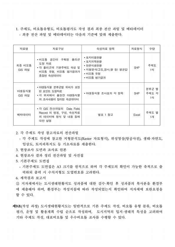 1. 주제도, 비오톱유형도, 비오톱평가도 작성 결과 최종 전산 파일 및 메타데이터 최종 전산 파일 및 메타데이터는 다음의 기준에 맞춰 제출한다. 자료명 자료구성 속성자료 항목 자료형식 수량 최종 비오톱 GIS 파일 ?비오톱 공간이 구획된 폴리곤 도형 자료 ?각 폴리곤의 기본주제도 속성 및 비오톱 유형, 비오톱 평가결과가 종합된 속성데이터 ?토지이용현황 ?토지피복현황 ?현존식생현황 ?지형분석 고도,경사,향 등 평균값 ?비오톱 유형 ?비오톱 평가결과 SHP 주제도 1식 야생동식물 GIS 파일 ?야생동식물 분류군별 위치가 표현 된 포인트 도형자료 ?각 위치에서 출현한 야생동식물 의 조사내용이 정리된 속성데이터 ?야생동식물 조사표의 각 항목 SHP 분류군 별 주제도 각 1식 메타데이터 ?각 GIS 전산파일의 Dat...