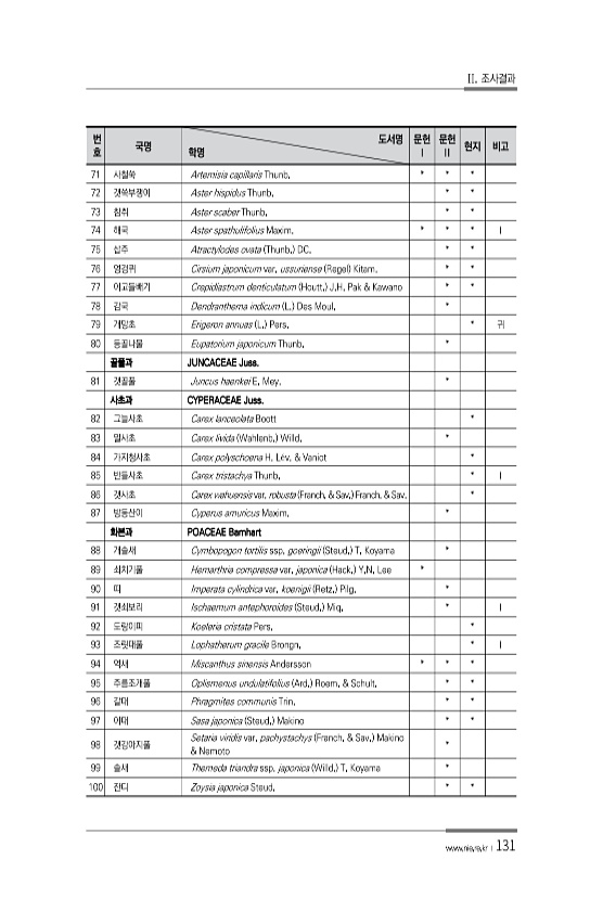 II. 조사결과 www.nie.re.kr ?131 번 호 국명 도서명 학명 문헌 Ⅰ 문헌 Ⅱ 현지 비고 71 사철쑥 Artemisia capillaris Thunb. * * * 72 갯쑥부쟁이 Aster hispidus Thunb. * * 73 참취 Aster scaber Thunb. * * 74 해국 Aster spathulifolius Maxim. * * * Ⅰ 75 삽주 Atractylodes ovata Thunb. DC. * * 76 엉겅퀴 Cirsium japonicum var. ussuriense Regel Kitam. * * 77 이고들빼기 Crepidiastrum denticulatum Houtt. J.H. Pak & Kawano * * 78 감국 Dendranthema indicum L. D...