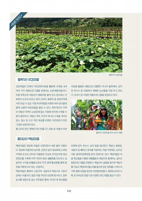 142 월학1리 냇강마을 ?꼼꼼가이드? 월학1리 냇강마을 옥수수따기 체험 냇강마을은 인제의 자연문화자원을 활용해 사계절 내내 여러 가지 체험프로그램을 운영하는 농촌체험마을이다. 마을 뒤쪽으로 대암산이 병풍처럼 둘려 있고 앞으로는 인 북천이 도도히 흐르고 있어 산천어, 열목어 등 청정지역에 서만 만날 수 있는 각종 희귀어종을 비롯한 여러 동식물과 함께 산골의 여유로움을 즐길 수 있다. 백두대간의 지맥 인 대암산 자락이 소양강에 닿는 지점에 위치해 사계절 수 량이 풍부하고, 대암산 계곡 구간의 하나인 소재골 계곡은 칡소, 뒹소 등 크고 작은 폭포를 비롯한 자연경관이 천연 그대로 보존되어 있다. 통나무로 만든 뗏목타기와 민물고기 관찰 등 마을의 하천 월학1리 냇강마을 자원을 활용한 체험프로그램뿐만 아니라 블루베리...