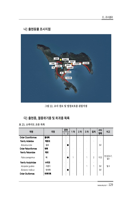 II. 조사결과 www.nie.re.kr ?129 그림 22. 조사 경로 및 법정보호종 관찰지점 , 학명 국명 문헌 1 차 2 차 3 차 합계 서식 1 2 형태 비고 Order Ciconiiformes 황새목 Family Ardeidae 백로과 Bubulcus ibis 황로 ● SV Order Falconiformes 매목 Family Falconidae 매과 Falco peregrinus 매 ● 1 1 2 RES 천 323-7, 멸 I Family Accipitridae 수리과 Accipiter gularis 조롱이 1 1 SV 멸 II Butastur indicus 왕새매 ● SV Order Gruiformes 두루미목 표 23. 소허사도 조류목록